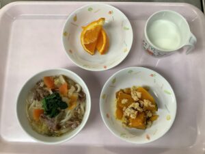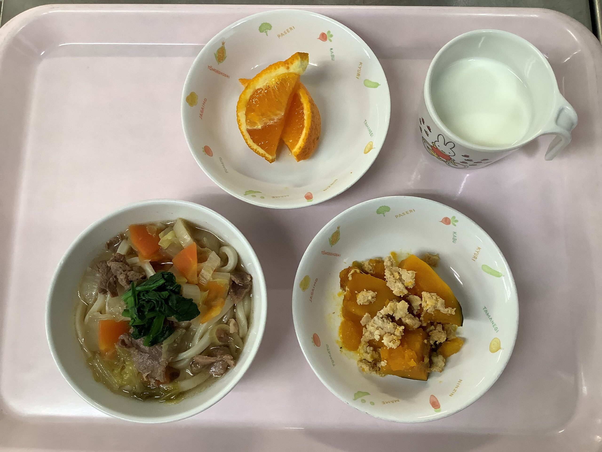 2月27日 牛肉の甘辛うどん かぼちゃのそぼろ煮